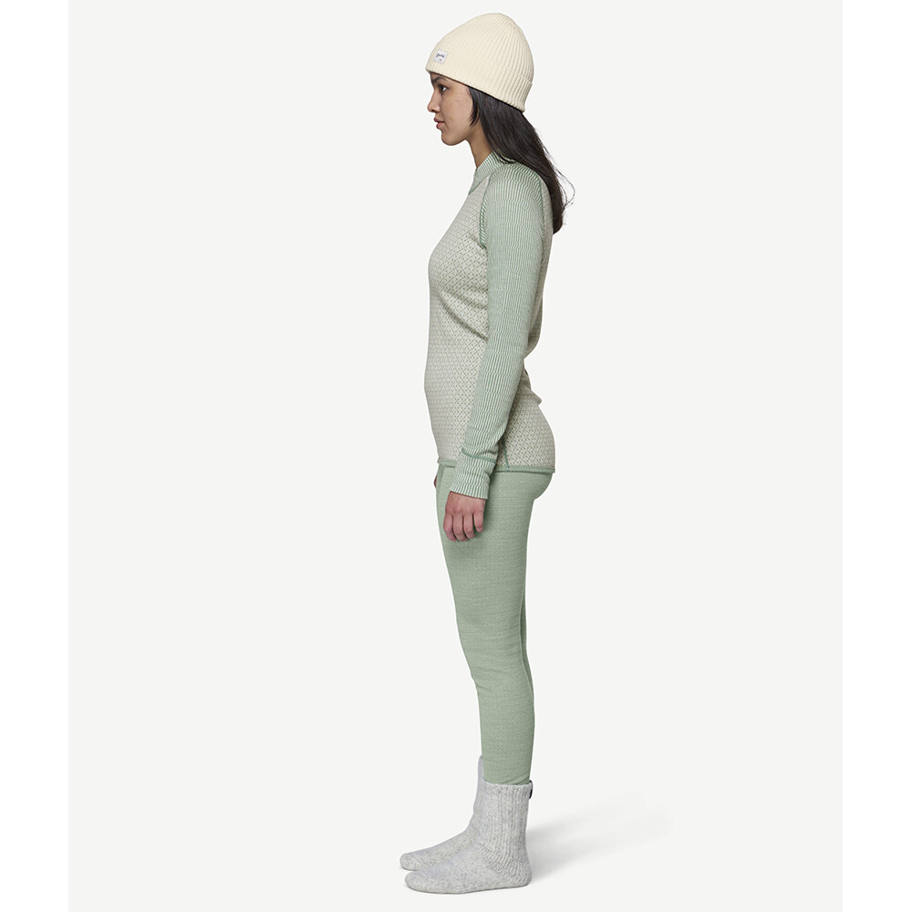 Cămașă reversibilă pentru femei cu guler ridicat Kvitegga Merino 230 Cross Neck de la compania norvegiană Devold. Este fabricată din 100% lână Merino. Buzunarele de aer microscopice ale lânii asigură o retenție optimă a căldurii.