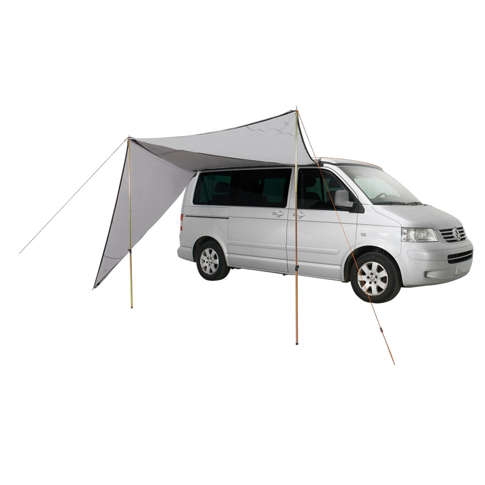 Lom Tri Canopy este un carport de la EasyCamp conceput pentru furgonete, rulote și rulote. Acesta este alcătuit din trei părți triunghiulare care pot fi conectate cu Velcro în mai multe moduri diferite. Pur și simplu configurați-l cu trei stâlpi cu înălțime reglabilă și cordoane de ancorare. Îl puteți atașa la vehicul prin intermediul unei bare de cedru sau prin acoperiș cu ajutorul corzilor de tensionare. Prin utilizarea adăpostului, obțineți protecție împotriva soarelui și a ploii, precum și un spațiu mai privat pentru gătit sau relaxare atunci când călătoriți și campați în mașină.