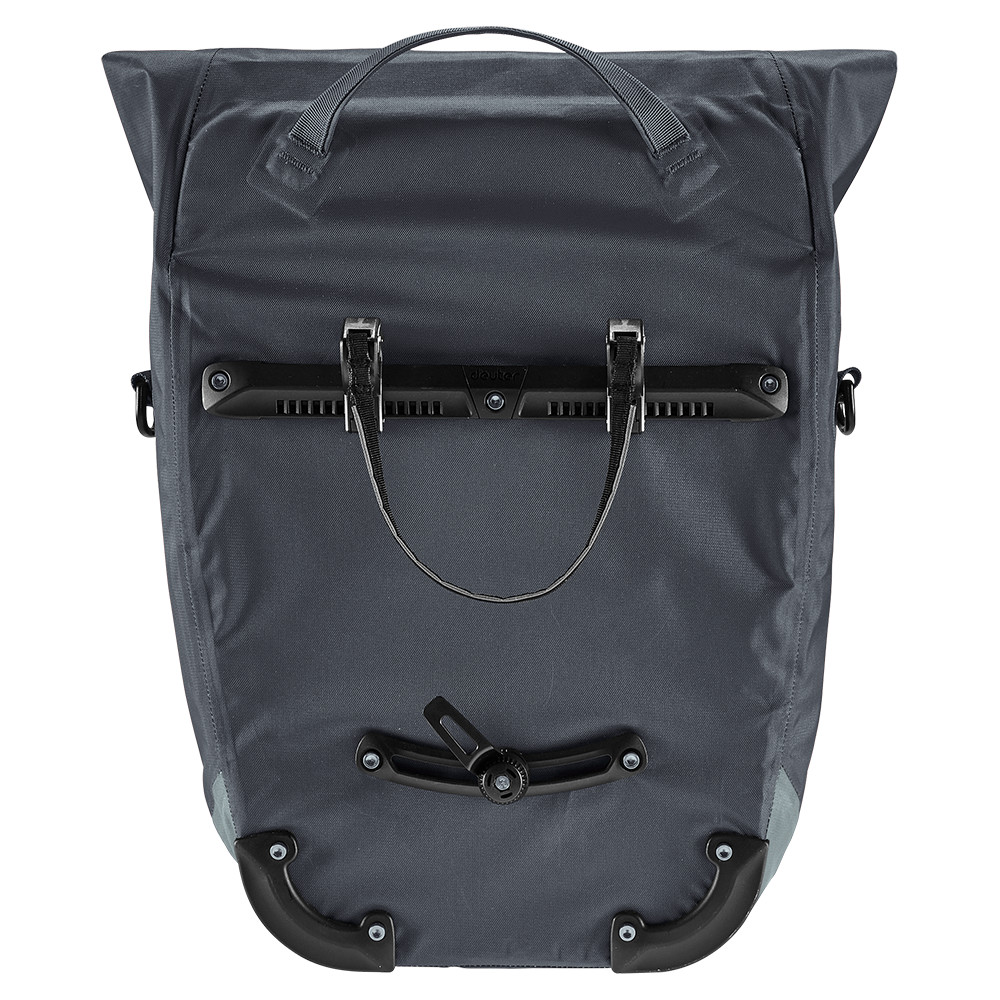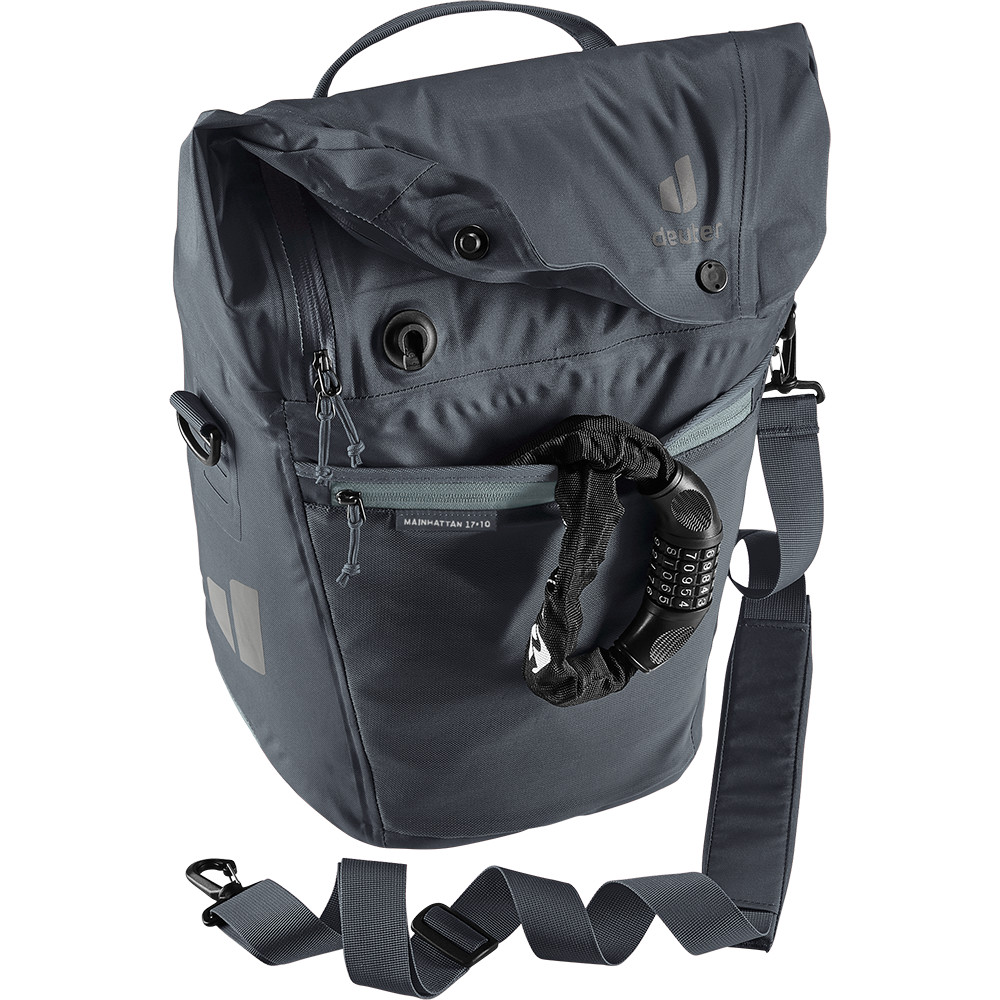 Sistemul nou dezvoltat BagFix cu eliberare rapidă de la deuter vă permite să pedalați în liniște, bicicleta suportând cea mai mare parte a încărcăturii - și nimic pe spate. Doar o tragere rapidă pe mânerul de eliberare și geanta este desprinsă și gata de utilizare ca geantă de umăr. Clapeta mare cu catarame magnetice vă permite să extindeți capacitatea cu încă 10 litri.