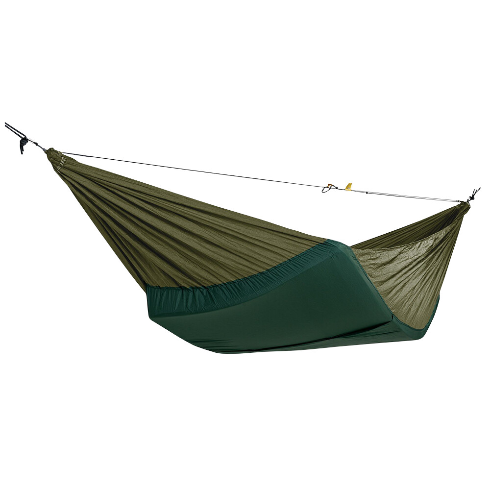 Hamacul de la Ticket To The Moon aduce o nouă soluție pentru a crește confortul de a dormi într-un hamac. În partea de jos a hamacului există un buzunar conceput pentru a găzdui o saltea. Acest lucru vă oferă mai mult confort atunci când vă culcați și, de asemenea, o izolare excelentă împotriva frigului de la sol. Buzunarul are dimensiunile 70x200 cm și, prin urmare, este potrivit pentru saltelele auto de dimensiuni standard. Pot fi utilizate diferite tipuri de saltele (gonflabile, autogonflabile și din spumă). De asemenea, este inclus un cablu de tensiune Ridge Line, două bucăți de carabiniere și un organizator pentru obiecte mici, cum ar fi o lampă de cap sau un telefon mobil.