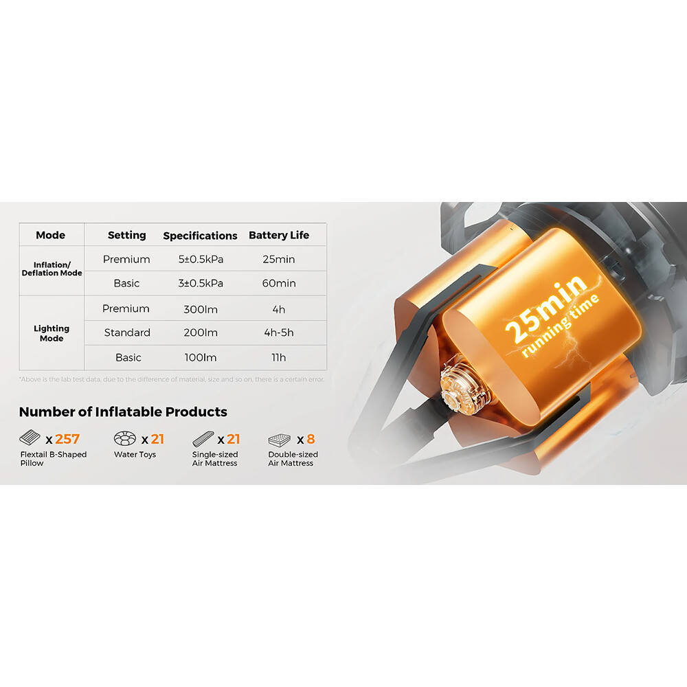 O pompă de aer reîncărcabilă de buzunar care funcționează și ca pompă de vid, lanternă și power bank. Utilizați-o pentru a umfla o saltea, o pernă de călătorie, o barcă mai mică sau un inel plutitor.