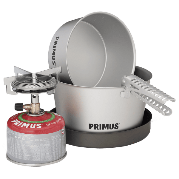 Kit complet de gătit în aer liber Mimmer Stove Kit II de la Primus. Acesta include aragazul pe gaz Mimer Stove, care are un arzător lat cu brațe fixe care oferă o stabilitate perfectă chiar și atunci când gătiți în recipiente mai mari. Acesta are o aprindere manuală la care se potrivește cel mai bine unul dintre brichetele de exterior. Setul include două cratițe de 2,3 l din aluminiu anodizat și o tigaie cu diametrul de 21 cm din același material. Setul este ideal pentru a găti pentru un grup mare de persoane (2 până la 5 persoane) sau pentru o familie. Ustensilele de gătit au o suprafață antiaderentă și sunt foarte ușor de curățat. Sunt incluse clești (oalele sunt fără mânere) și un capac cu perforații pentru turnarea comodă a excesului de apă.