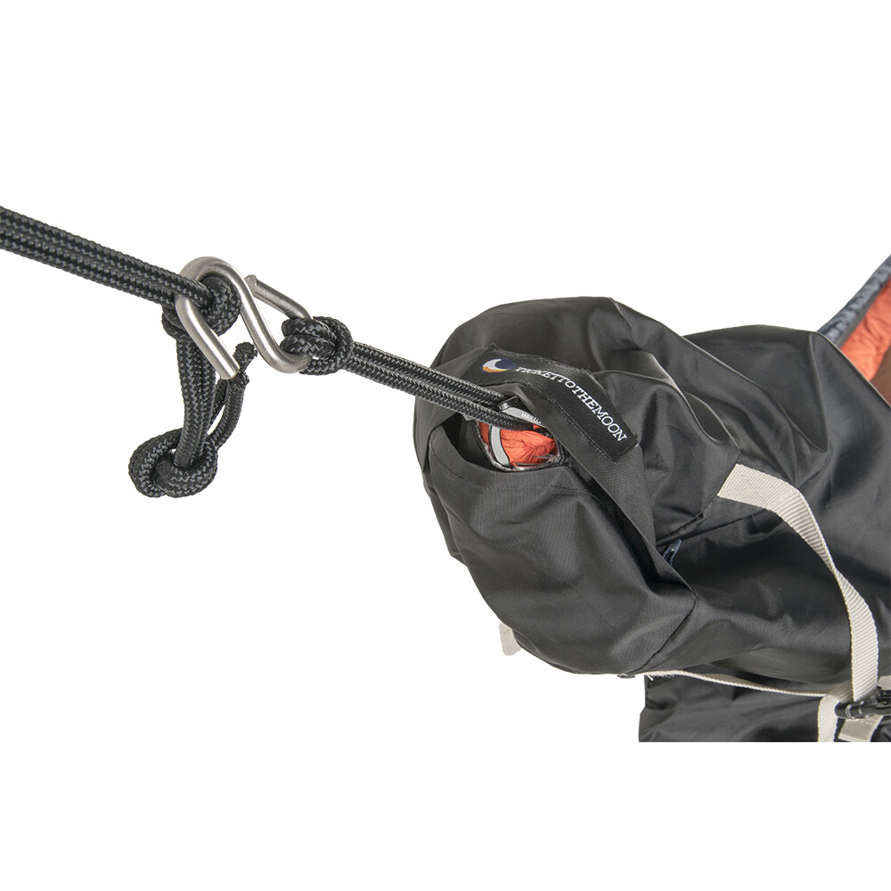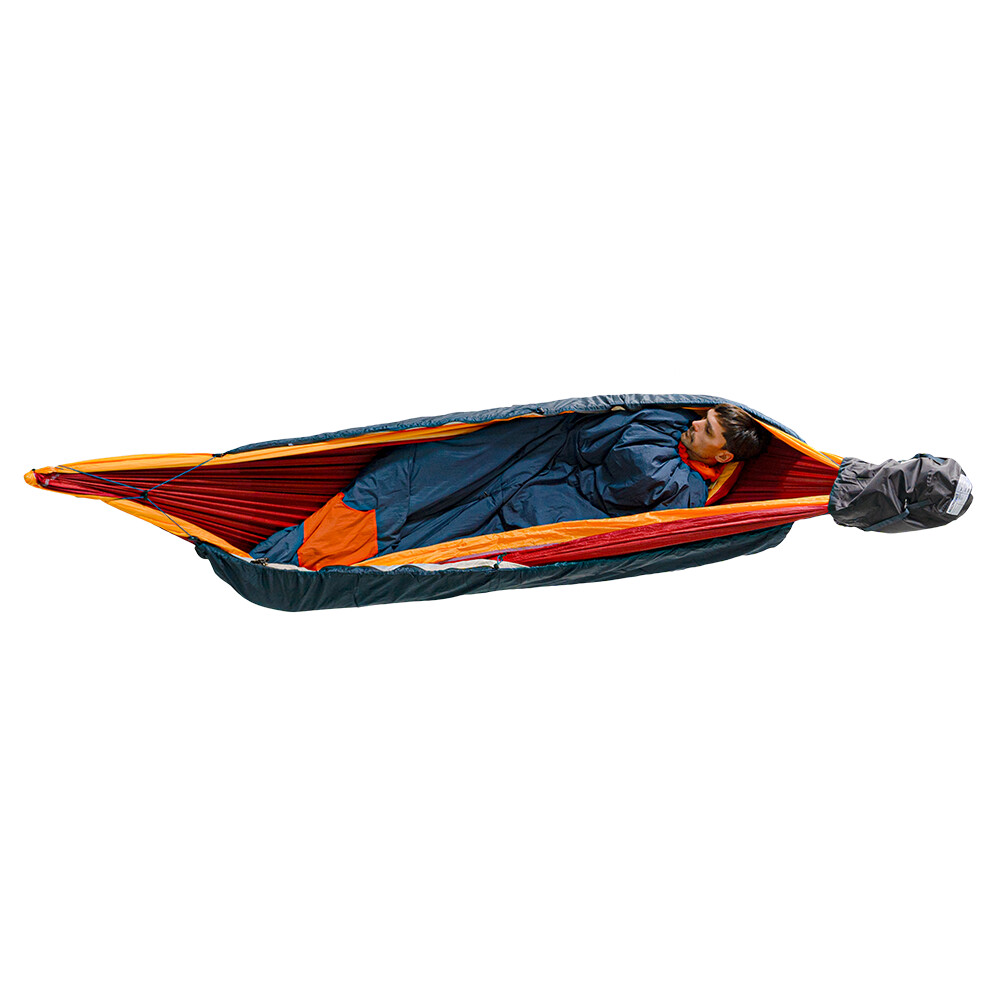 Moonquilt Allround este o protecție termică pentru hamace de la Ticket To The Moon. Are două fermoare și două șnururi pentru un control confortabil al temperaturii în interiorul hamacului. În caz de vreme vântoasă, puteți închide cu fermoar plapuma în jurul hamacului și vântul nu vă va atinge deloc. De asemenea, este inclusă o glugă detașabilă, astfel încât să puteți folosi Moonquilt pe cont propriu, ca un sac de dormit tradițional, atunci când dormiți în interiorul sau în afara hamacului. Izolația interioară este fabricată din material PET reciclat, este impermeabilă și rezistă bine la mucegai.