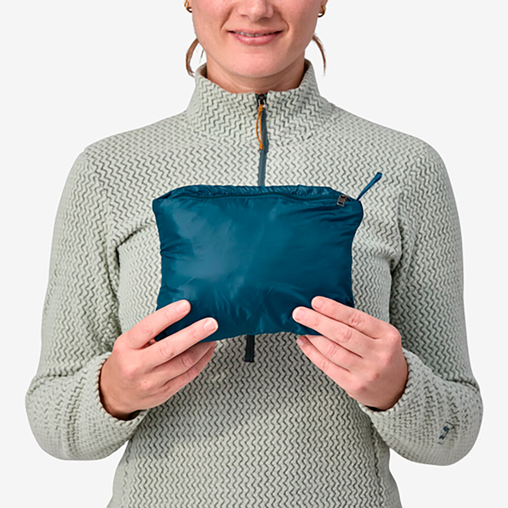 Vesta izolată pentru femei cu design unic de matlasare de la Patagonia. Materialul exterior rezistent la vânt este fabricat din poliester reciclat cu tratament DWR pentru rezistență sporită la apă. Căldura este asigurată de 60 de grame de umplutură Eco PrimaLoft® Gold Insulation incredibil de ușoară și foarte compresibilă.
