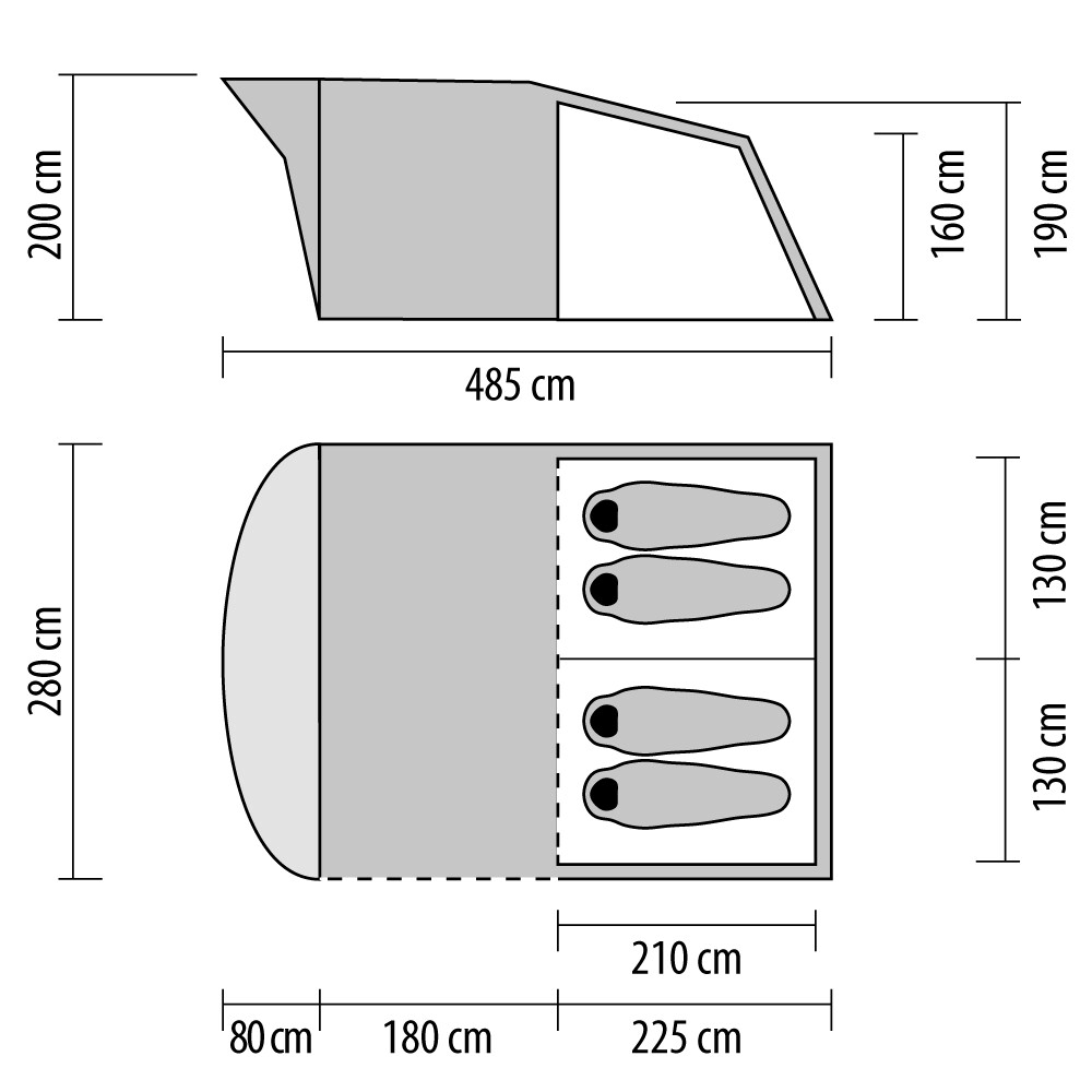 Cort pentru patru persoane. Are două dormitoare separate și două intrări care pot fi deschise ca o copertină. Tehnologia Blackout (dormitor blackout) ține departe lumina zilei și permite un somn mai lung.