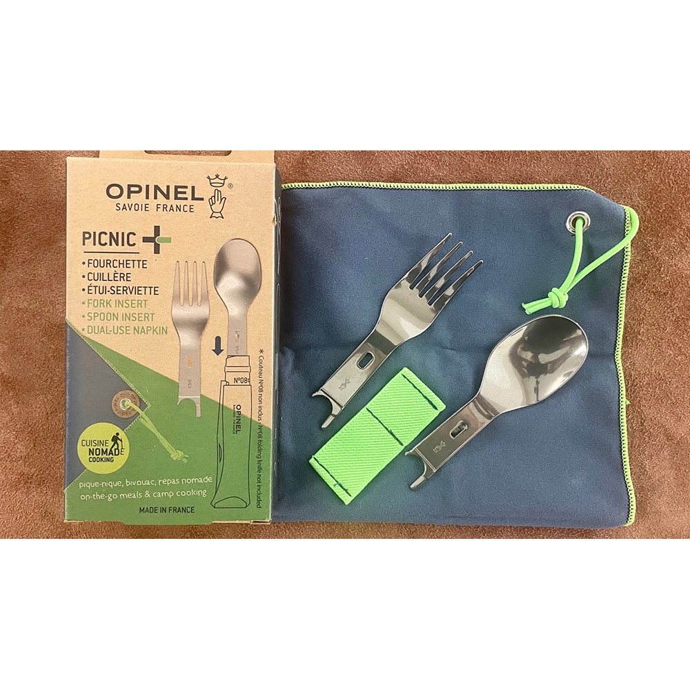 Set Opinel practic pentru mese în mișcare. Include două accesorii interschimbabile, furculiță și lingură. Uneltele sunt fabricate din oțel inoxidabil și sunt compatibile cu toate cuțitele Opinel mărimea 8°. Este inclus un șervețel din microfibră care servește ca husă de transport sau pentru curățare. Setul de tacâmuri poate fi folosit pentru prânzul de zi cu zi la locul de muncă sau la camping, iar datorită greutății reduse, întregul set este potrivit și pentru excursii de mai multe zile cu rucsacul în spate.