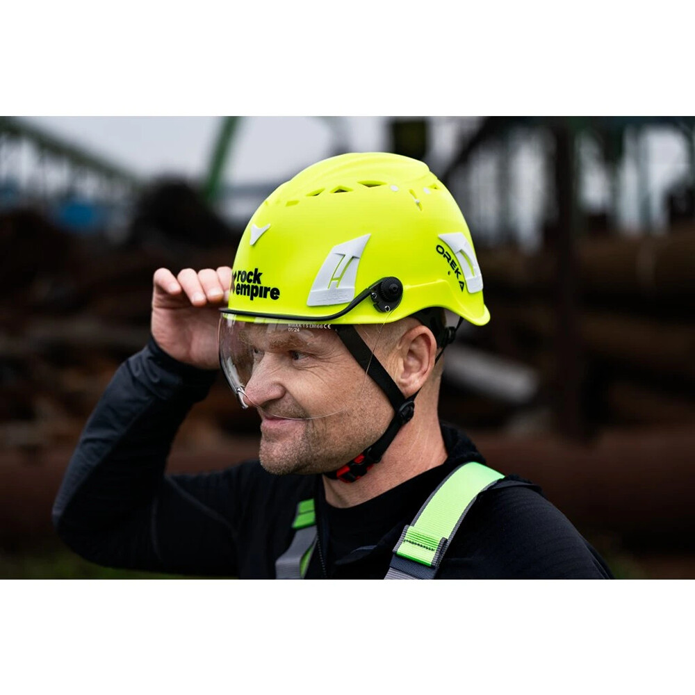 Un scut orca marca Rock Empire care servește ca protecție a ochilor de pericolele particulelor zburătoare. Potrivit pentru atașarea la casca Rock Empire Oreka.