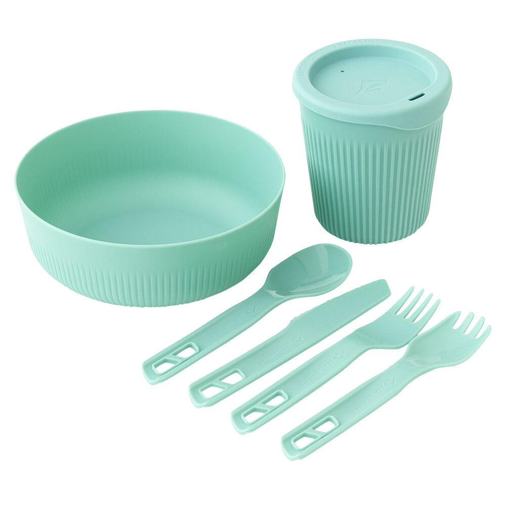 Set de veselă de călătorie de la Sea To Summit fabricat din polipropilenă durabilă și sigură pentru sănătate. Este potrivit pentru o persoană și include un castron (720 ml), o cană cu capac (355 ml) și tacâmuri complete (lingură, spork, furculiță, cuțit). Piesele sale individuale pot fi combinate pentru a crea o versiune extinsă și reversibilă, care este perfectă pentru a mânca alimente deshidratate direct din recipient, de exemplu. Suprafața exterioară canelată a vasului de gătit absoarbe mai bine temperatura alimentelor și nu trebuie să vă faceți griji că vă ardeți mâinile.