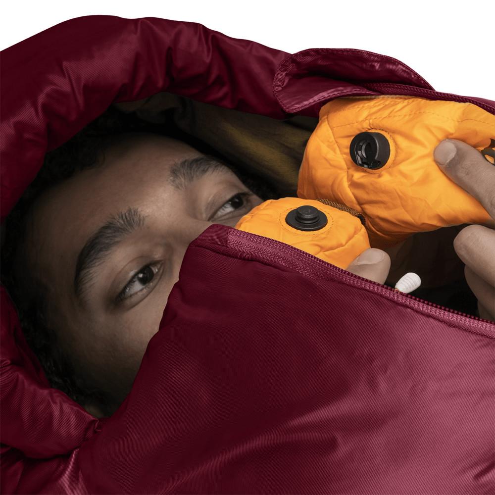 Sac de dormit pentru trei anotimpuri cu umplutură din material reciclat. Are un fermoar frontal, o glugă cu cordon și un guler interior. Forma de mumie urmărește perfect silueta și elimină pierderea de căldură în timpul mișcării în timpul somnului.
