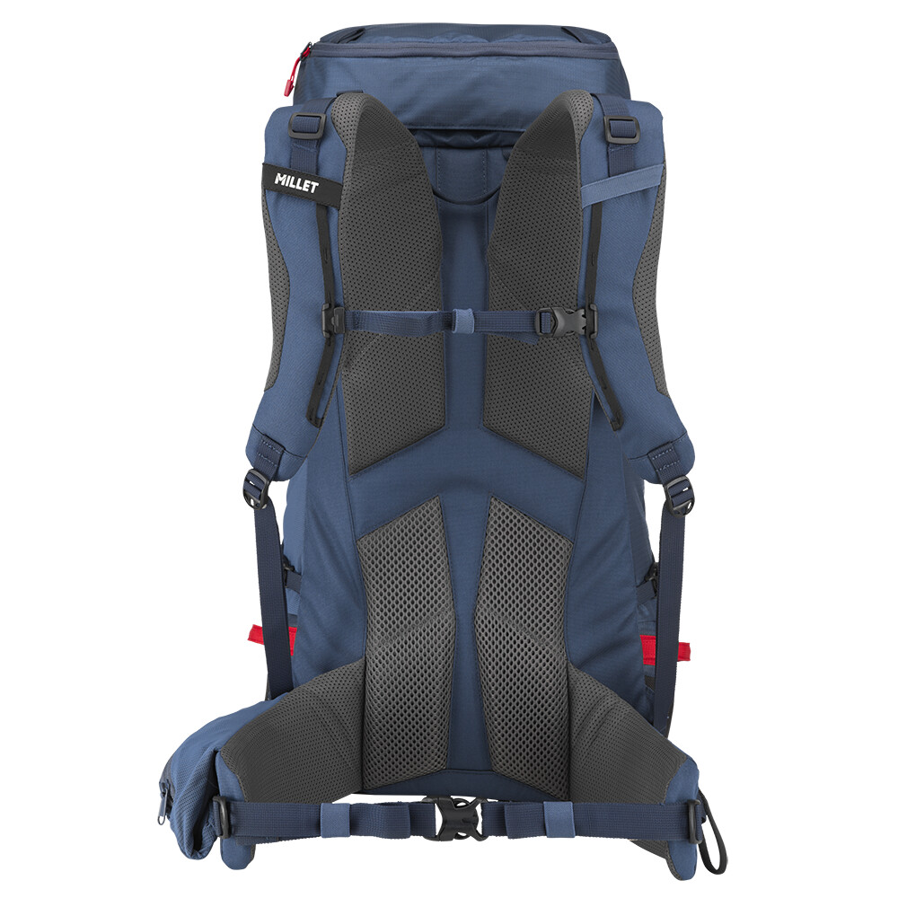 Rucsac de alpinism cu închidere superioară roll-top și intrare laterală cu fermoar. Poate transporta frânghii, pioleți, bețe, schiuri și bucle pentru suport cască. Are un spate din spumă conturată și o curea de talie cu buclă de material.