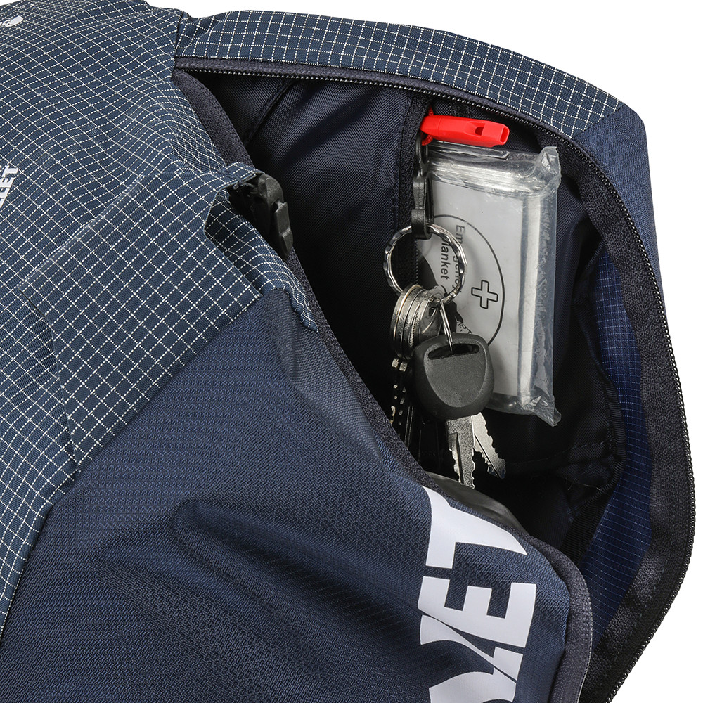 Rucsac de schi cu închidere roll-top complet cu fermoar lateral pe toată lungimea. Poate transporta schiuri pe lateral sau în diagonală, bucle pentru pioleți, bețe și suport pentru cască. Buzunar pentru sticlă pe cureaua de umăr.