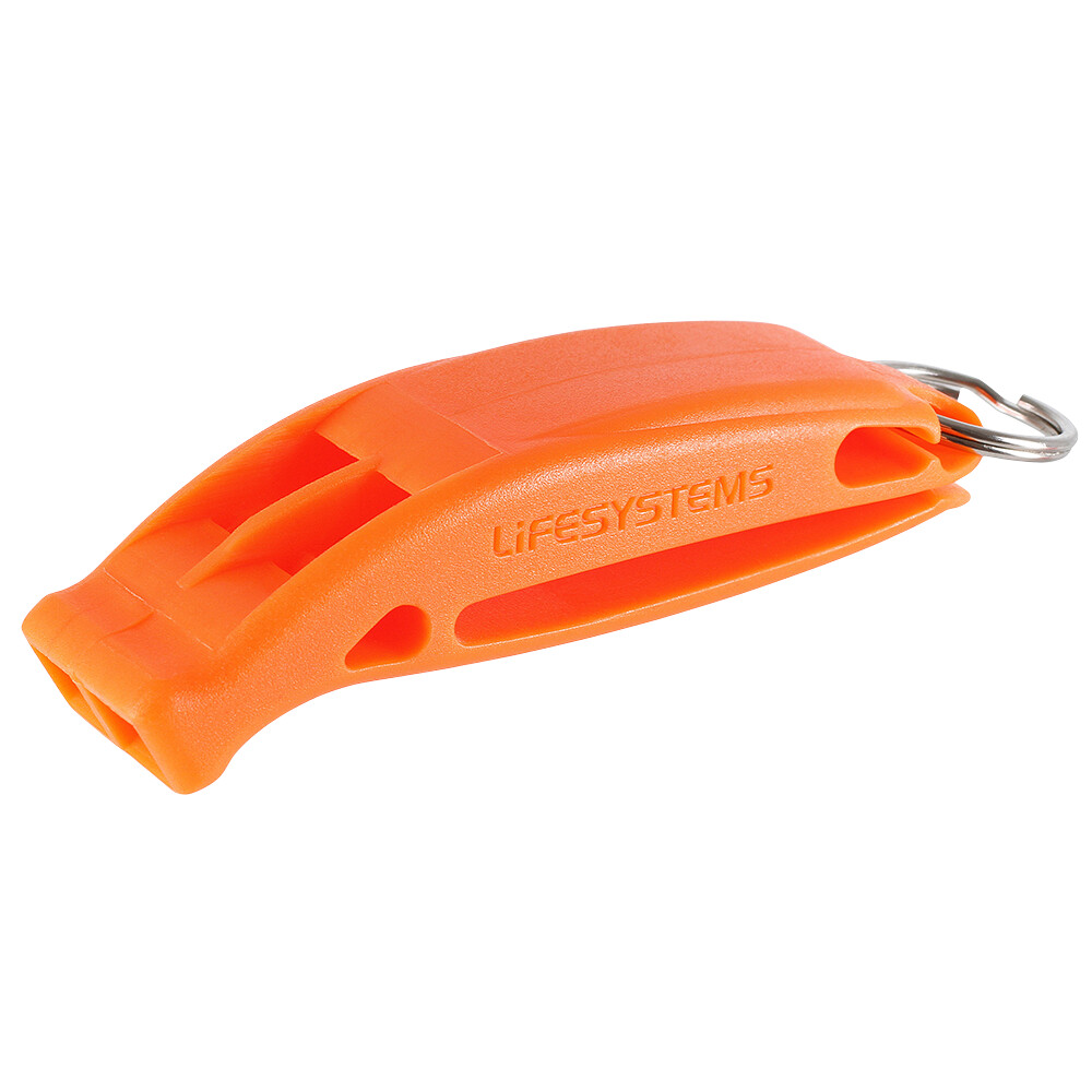 Fluier de la Lifesystems pentru apel de urgență pentru ajutor. Are un volum de 116 dB de ton dublu înalt, plutește pe apă și poate fi atârnat în jurul gâtului sau atașat la rucsacuri, curele și alte echipamente cu un clip.