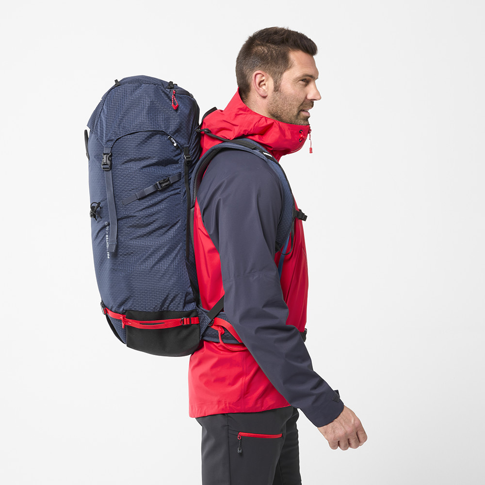 Rucsac de alpinism cu închidere superioară roll-top și intrare laterală cu fermoar. Poate transporta frânghie, pioleți, bețe și bucle pentru suport pentru cască. Dispune de un spate din spumă conturată, curea reglabilă pentru piept și talie.