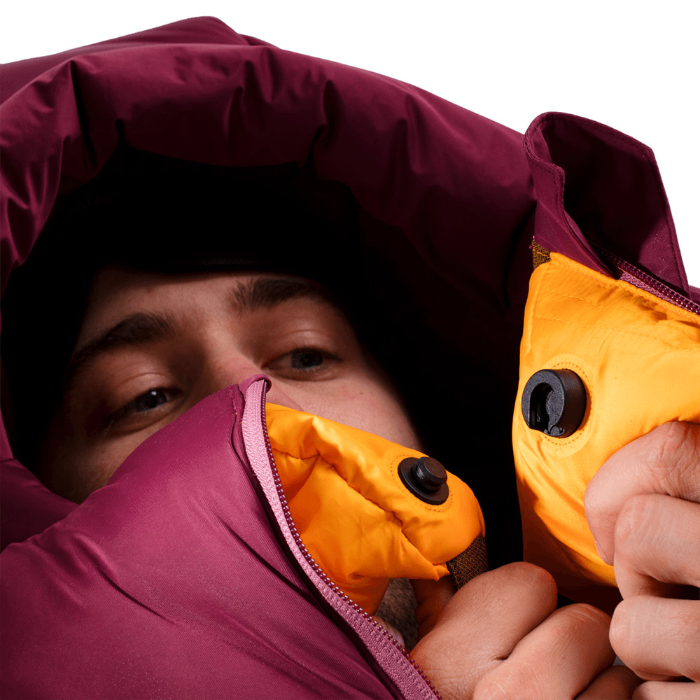 Sac de dormit pentru trei anotimpuri cu umplutură din material reciclat. Are un fermoar frontal, o glugă cu cordon și un guler interior. Forma de mumie urmărește perfect silueta și elimină pierderea de căldură în timpul mișcării în timpul somnului.