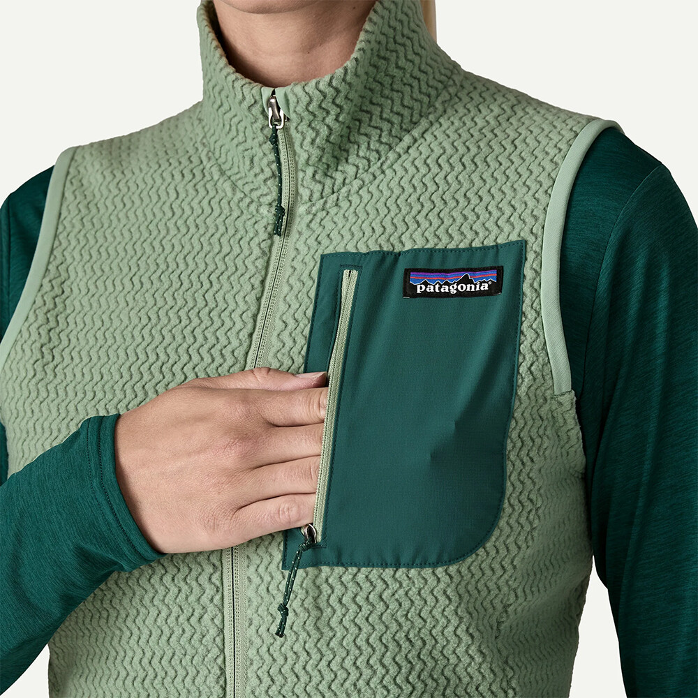 Vestul R1 Air Vest Women de la Patagonia este conceput pentru activități intense în condiții variabile. Pâsla ușoară reciclată cu miez gol evacuează excelent umezeala, se usucă rapid și respiră bine chiar și la sarcini mai mari datorită structurii jacquard specifice.