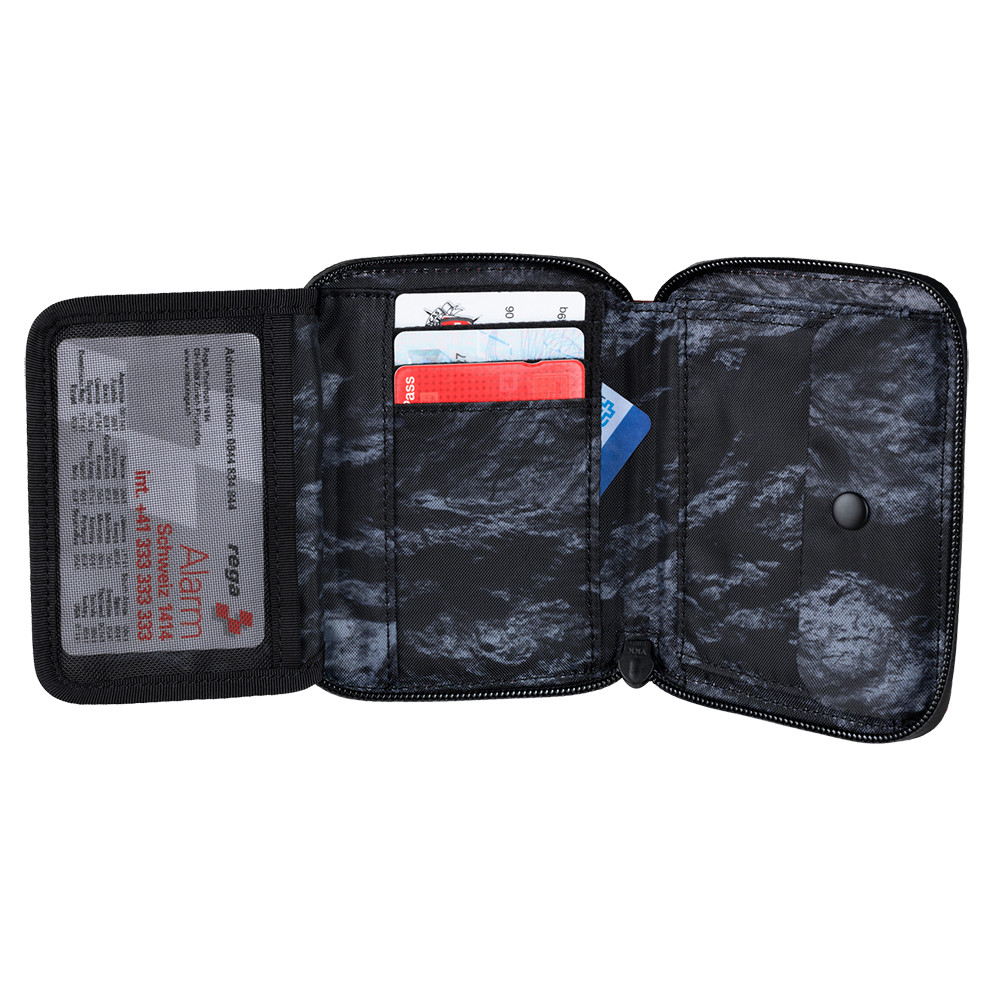 Portofel de călătorie pentru documente, bani, carduri de credit și alte obiecte de valoare. Are două buzunare cu fermoar, profil plat, este fabricat din material ușor și se ascunde perfect sub haine. Conceput pentru a fi purtat în jurul gâtului.