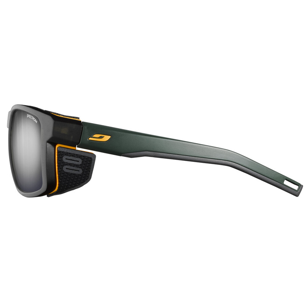 Scuturile laterale detașabile sunt realizate din țesătură moale pentru a nu irita pielea supusă înghețului. De asemenea, acestea protejează perfect ochii din lateral. Raza antiderapantă absoarbe șocurile, iar părțile laterale cu finisaj neted nu prind părul și țin ochelarii perfect în poziție. Filtrul solar de categoria 4 protejează vederea alpiniștilor și excursioniștilor de soarele aspru.