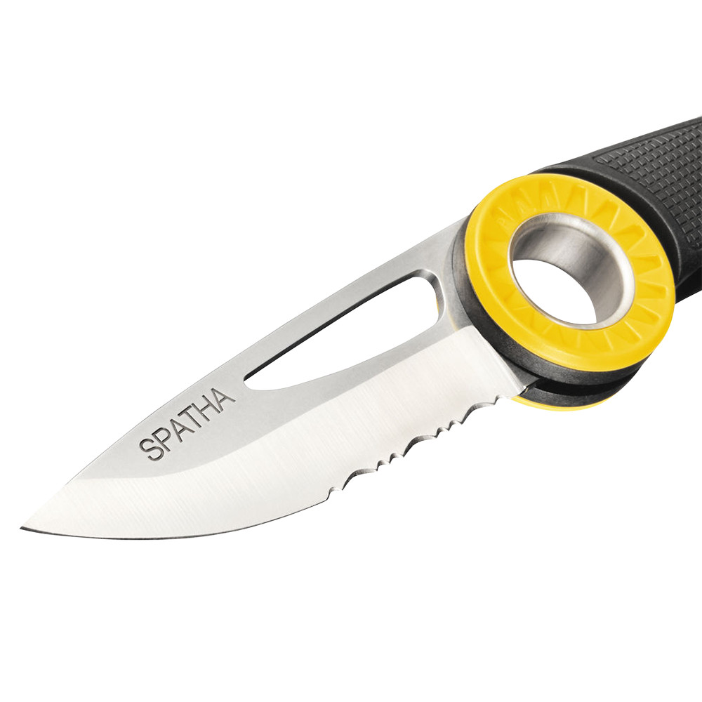 Cuțitul de deschidere Spatha de la Petzl este conceput pentru a însoți alpinistul în fiecare călătorie de alpinism. Forma lamei combinate cu zimți facilitează tăierea frânghiilor și a chingilor. Are un orificiu pentru atașarea unui carabinier la ham. Ușor de deschis cu roata rugoasă chiar și cu mănuși și o singură mână.