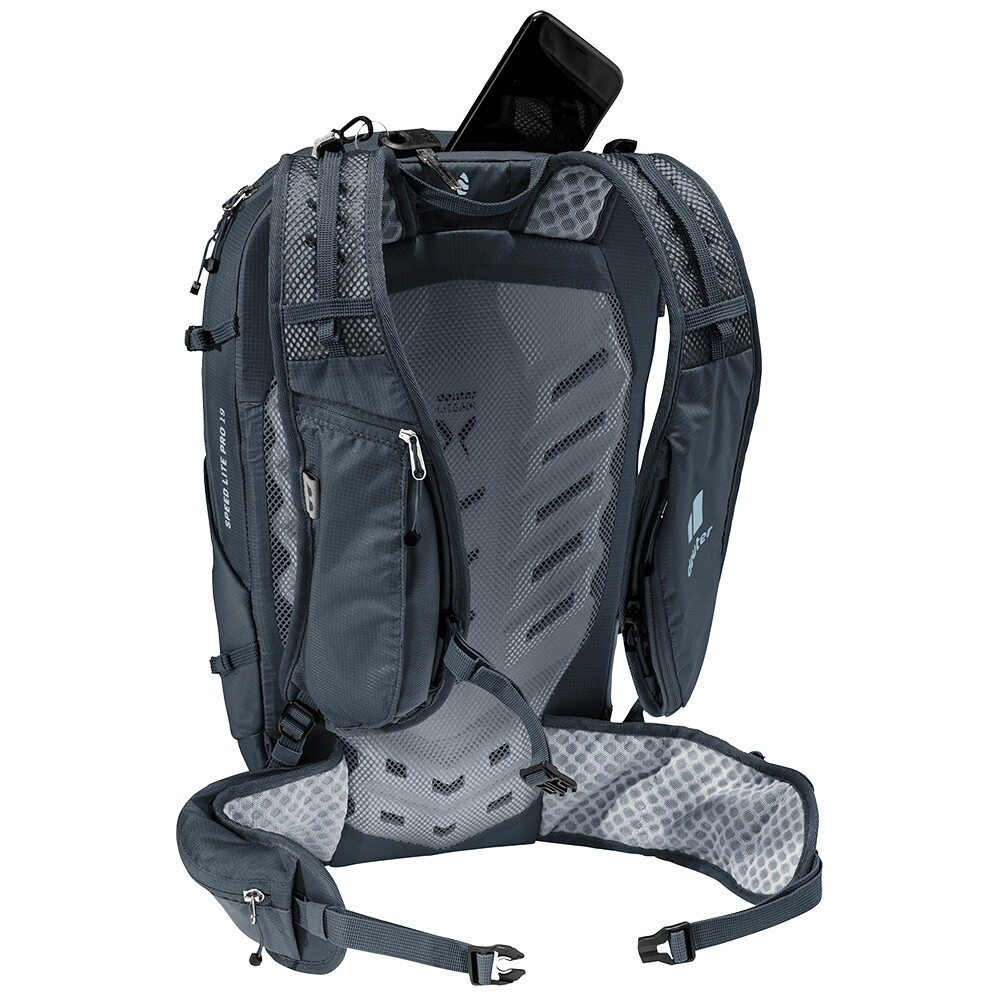 Gama Speed Lite Pro oferă o serie de soluții inteligente de depozitare. Buzunarele de pe curelele de umăr și aripioarele lombare permit accesul rapid la sticlă, batoanele energizante sau dispozitivul GPS. Un sistem de eliberare rapidă pe curelele de umăr facilitează manevrarea bastoanelor fără a scoate rucsacul.