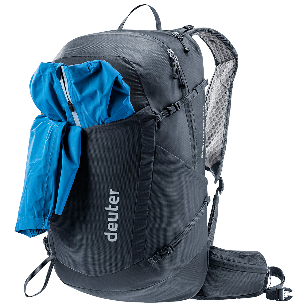 Gama Speed Lite Pro oferă o serie de soluții inteligente de depozitare. Buzunarele de pe curelele de umăr și aripioarele lombare permit accesul rapid la sticlă, batoanele energizante sau dispozitivul GPS. Un sistem de eliberare rapidă pe curelele de umăr facilitează manevrarea bastoanelor fără a scoate rucsacul.