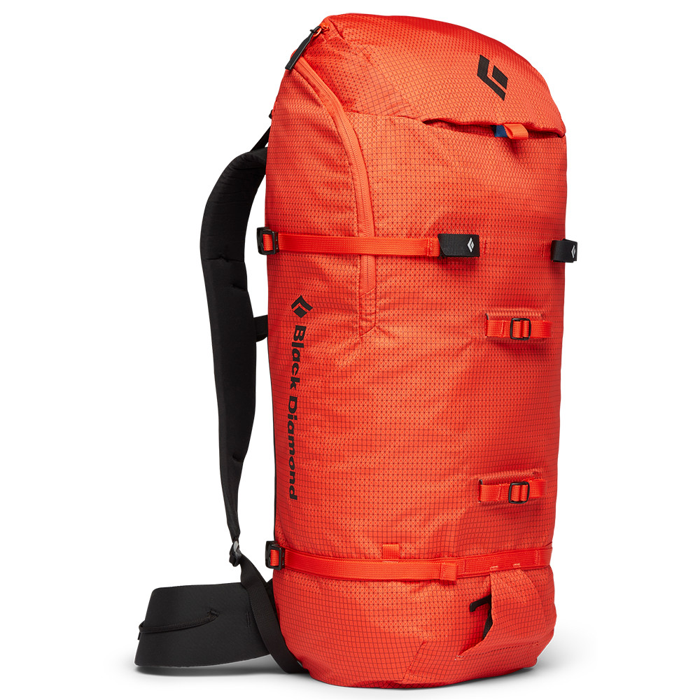 Rucsac de alpinism cu fermoar lateral pe toată lungimea pentru acces ușor, panou spate turnat termic, curea de frânghie și un atașament de rulare care se dublează ca un suport pentru cască.