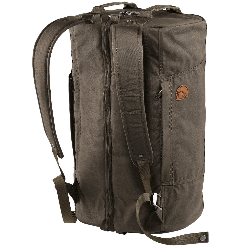 O geantă de călătorie Fjällräven pe care o puteți purta pe umeri ca un rucsac. Fermoarul lung poate fi deschis ca o valiză. În interior este împărțită în două compartimente separate.