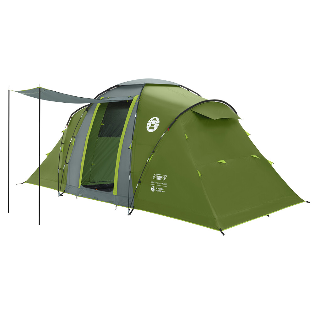 Spruce Falls 4 Blackout de la Coleman este un cort potrivit pentru camping pentru o familie sau un grup de prieteni. Forma sa combină construcția de tip tunel și dom. Cortul are două intrări în mijloc, care pot fi folosite ca o copertină cu doi stâlpi pentru a crea o zonă umbrită în fața cortului, ideală pentru a sta pe un scaun de camping. Cortul este bine ventilat și, datorită ventilației din plasă, permite aerului să treacă fără a introduce insecte nedorite.