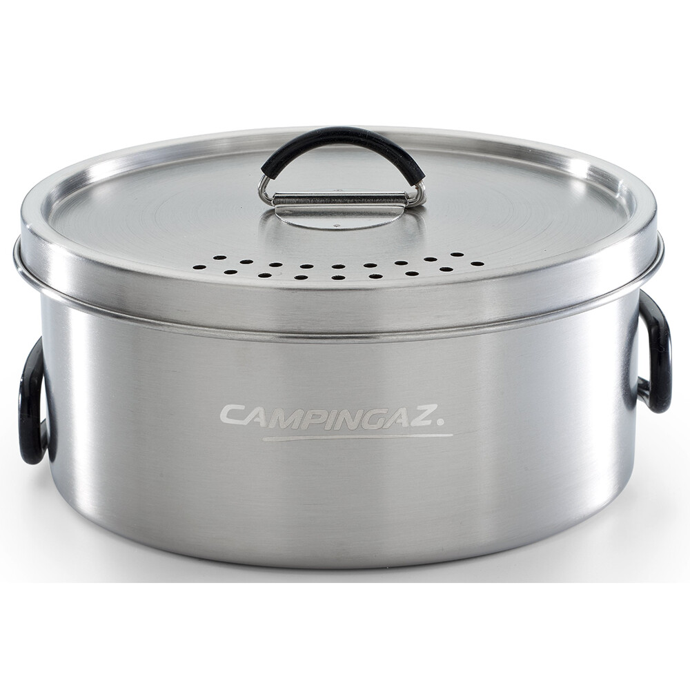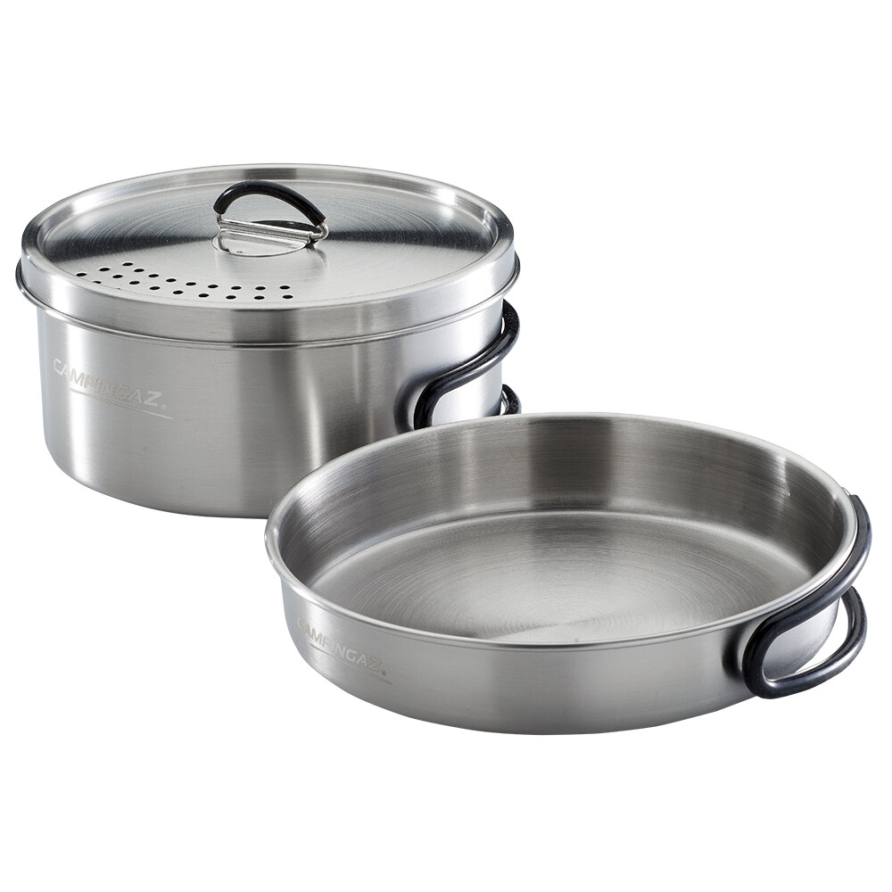 Set de trekking din oțel inoxidabil de la Campingaz, format dintr-o oală de 14,5 x 6,5 cm cu capac inclus și o tigaie de 15,5 x 3 cm. Ustensilele sunt fabricate din oțel inoxidabil și un mâner din silicon. Setul este livrat într-un ambalaj practic.