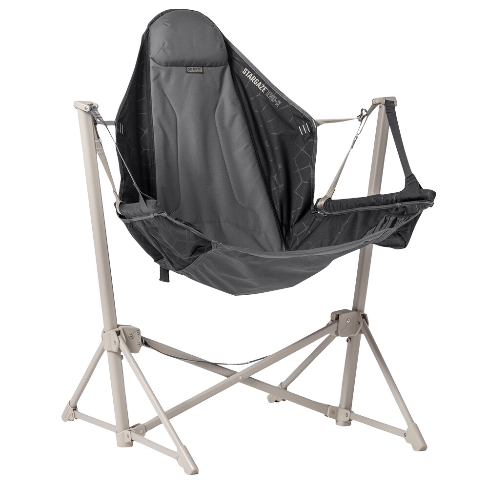 Fotoliul Stargaze Evo-X de la Nemo vă oferă o zonă de ședere confortabilă și o experiență plăcută de legănare pe deasupra. Cadrul este fabricat din aluminiu aeronautic durabil și totul este pregătit pentru o asamblare foarte simplă, într-o singură etapă. Nu aveți nevoie de unelte și nu este nevoie de reglarea complicată a pieselor individuale. În același timp, scaunul Stargaze Evo-X își păstrează reglabilitatea totală (reglarea înclinării spătarului, cotieră și tetieră reglabilă pe înălțime). Pe părțile laterale veți găsi buzunare pentru a vă depozita băutura, telefonul mobil sau lanterna frontală. Datorită celor șase puncte de sprijin, acesta este foarte stabil pe diferite tipuri de suprafețe (nisip, teren stâncos, teren moale). Scaunul este un produs certificat Bluesign®. Bucurați-vă de o mișcare lină de legănare, ca într-un hamac.