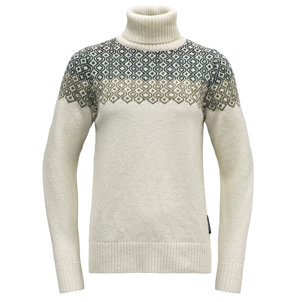 Pulover elegant pentru femei cu gât înalt Syvde Wool High Neck de la brandul norvegian Devold. Este fabricat din 100% lână extra fină și moale cu modele subtile. Stratul cald perfect sub o jachetă impermeabilă sau izolată. În puloverul Syvde veți străluci în munți și în oraș.