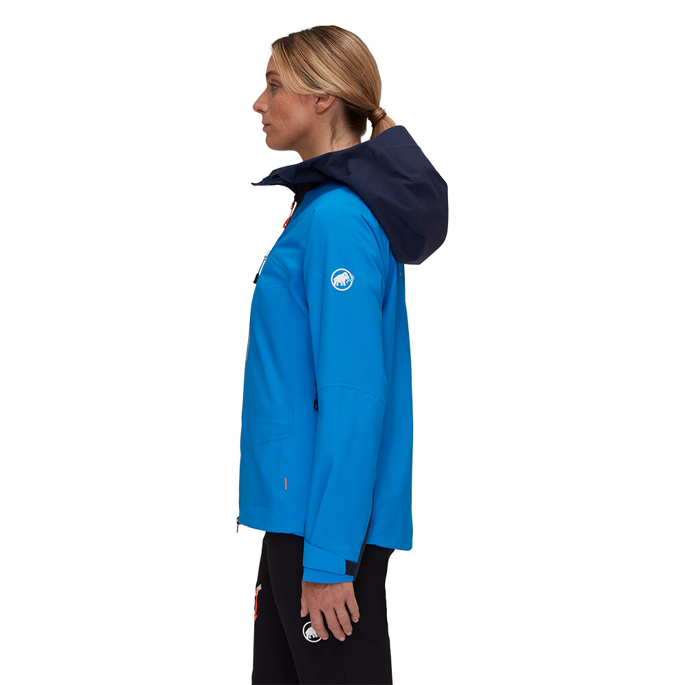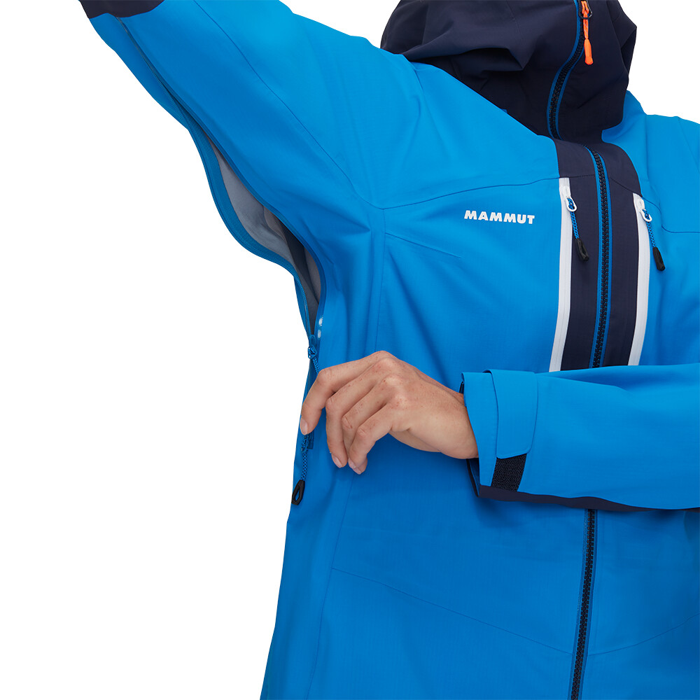 Această jachetă foarte respirabilă este fabricată din țesătura cu trei straturi DRYTechnology Pro de la Mammut, care vă protejează atât de vânt, cât și de ploaie. Tehnologia MAMMUT High Reach Technology™ asigură o mișcare nerestricționată. Capota cu vizieră ranforsată este compatibilă cu casca și ușor reglabilă. Cele două buzunare frontale sunt perfect accesibile chiar și cu un ham de alpinism sau o curea de șold pentru rucsac. Gurile de aerisire cu fermoar la subraț permit reglarea temperaturii în timpul efortului sporit sau al vremii mai calde. Mânecile preformate sunt reglabile cu Velcro. tivul inferior și gluga pot fi ajustate cu ușurință chiar și cu mănuși pe cap.