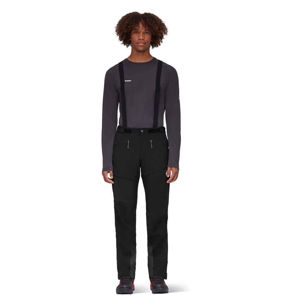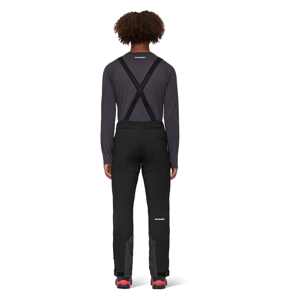 Tricotajul dublu periat softshell este cald și rezistent la vânt, dar asigură și o absorbție excelentă a umidității. Ventilația cu fermoar lateral permite reglarea temperaturii. Genunchii preformați oferă libertate de mișcare. Buzunarele cu fermoar sunt perfect accesibile chiar și atunci când purtați o șa de alpinism. Picioarele ranforsate pe interior rezistă la muchii de schi și crampoane. Manșetele de zăpadă pot fi atașate la cizmele de drumeție datorită cârligului.