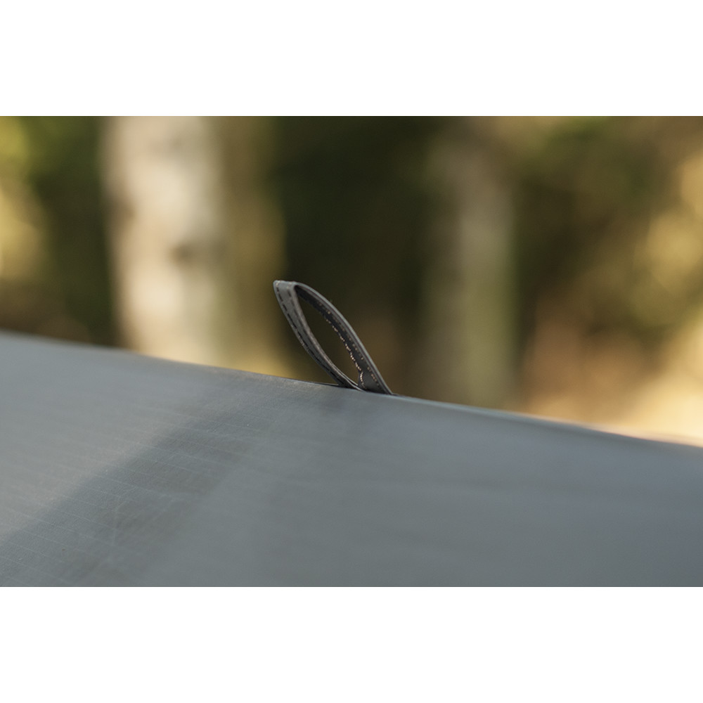 Adăpost minimalist ca protecție împotriva ploii și a soarelui. Construcție cu bețe de drumeție, prin întindere între copaci sau la o bicicletă. Dispune de puncte de ancorare întărite și cordoane detașabile pentru ambalare curată.