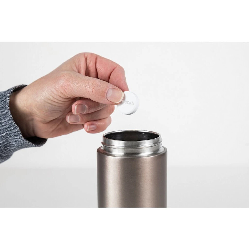 Pentru a vă menține sticla preferată de Kambukka curată, strălucitoare și fără miros, folosiți tabletele de curățare The Queen of Clean. Doar umpleți sticla cu apă fierbinte, adăugați tableta și așteptați aproximativ treizeci de minute. Ești gata!