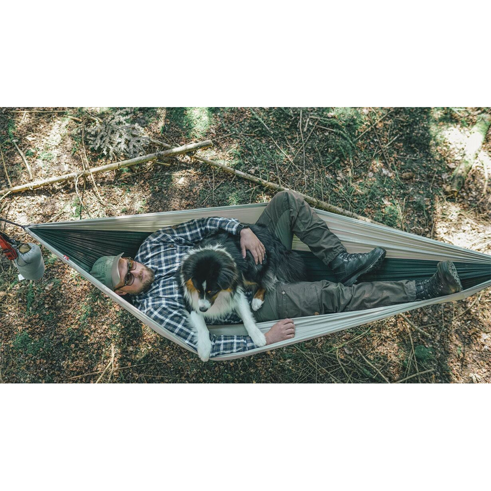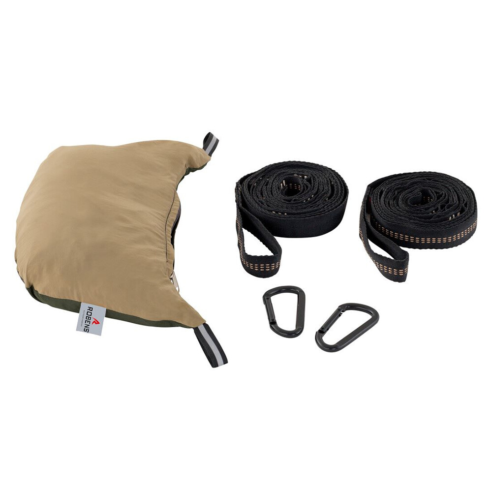 Setul complet Trace Hammock de la Robens, care include tot ce aveți nevoie pentru a dormi într-un hamac. Este inclus un hamac spațios, cu o capacitate de încărcare de până la 200 kg, două curele plate, carabiniere pentru fixarea între copaci și o geantă de transport. Husa este bine fixată pe hamac și poate fi folosită și ca buzunar pentru obiecte mici(lanternă frontală, telefon mobil) în timp ce dormiți sau vă odihniți.