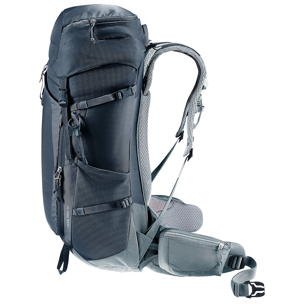 Partenerul perfect pentru escalada ferrata, acesta este animalul de companie de la deuter, Trail Pro 36. Veți aprecia acest rucsac mai ales pentru stabilitatea sa bună, deoarece se așează perfect pe spate datorită sistemului de spate Airstripes dovedit. Se sprijină pe un cadru flexibil Delrin® în formă de U, care distribuie greutatea uniform. Două benzi de spumă turnată cu plasă respirabilă fac contact minim cu spatele, permițând o ventilație maximă datorită efectului de coș de fum. În combinație cu curelele de umăr perforate mobile, cu cureaua reglabilă pentru talie și cu cureaua pentru stern, Trail Pro 36 se potrivește spatelui ca și cum ar face parte din el, menținându-vă uscat și confortabil chiar și atunci când vă deplasați rapid.