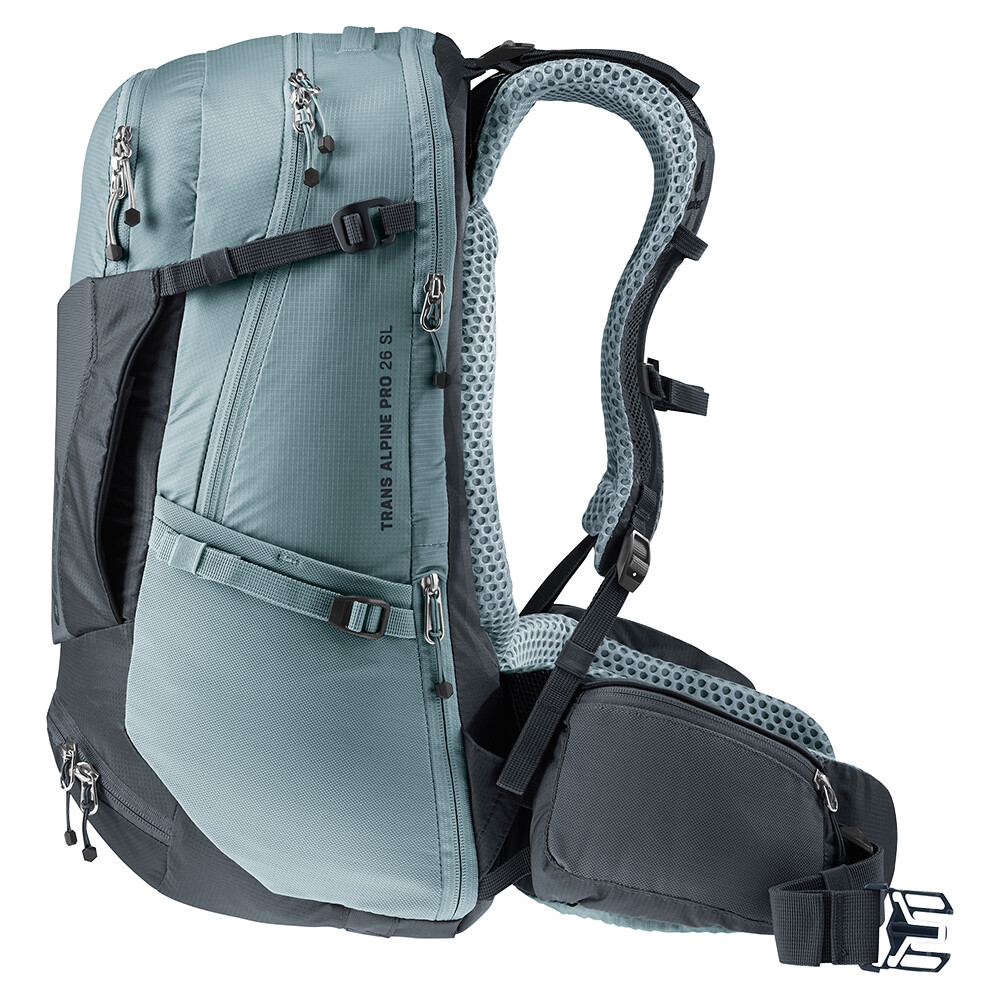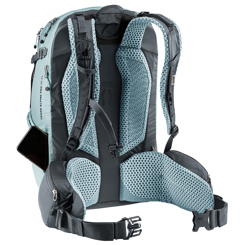 Trans Alpine Pro 26 SL pentru femei are sistemul de spate Airstripes, al cărui design ușor cu plasă Air Spacer respirabilă și contact minim cu corpul vă menține spatele uscat chiar și pe urcări lungi și solicitante. Curelele de umăr ergonomice și căptușite și un cadru X din aluminiu ajută la distribuirea confortabilă a încărcăturilor mai grele.