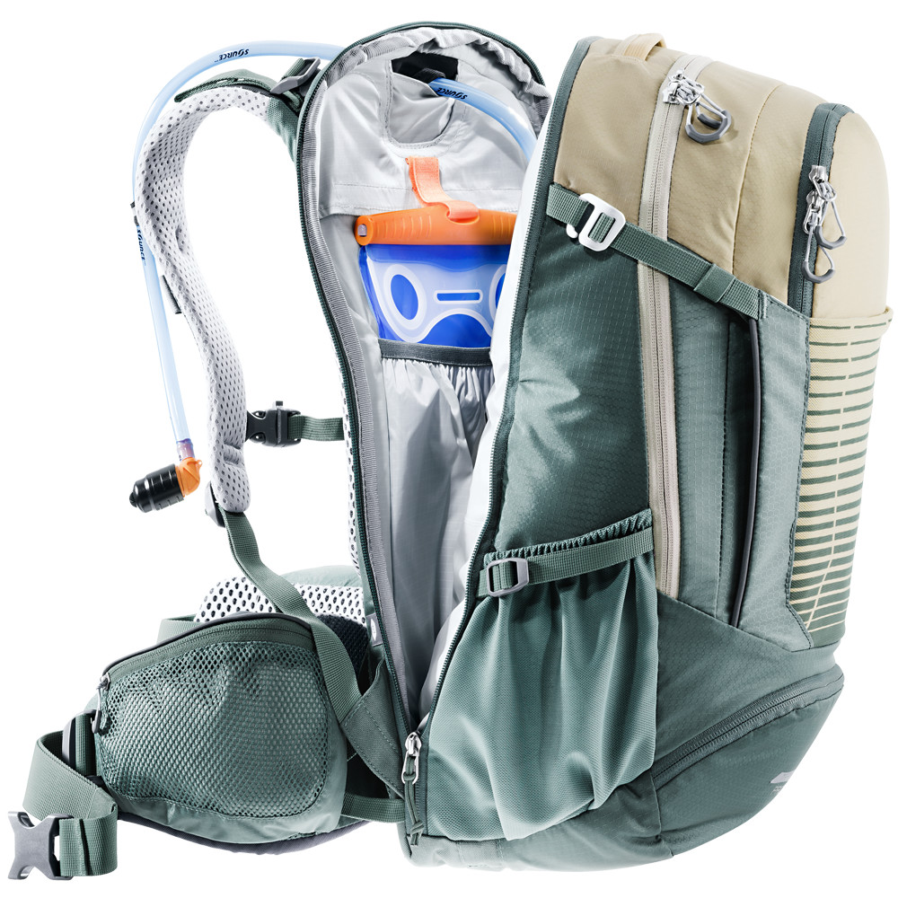 Elementul principal este un spate confortabil și respirabil cu panouri Airstraps căptușite. Întăririle metalice din spate sunt un bun ajutor în distribuirea greutății transportate. Când ajungeți în punctul în care trebuie să coborâți din șa, să reglați curelele de umăr puțin mai jos și să vă întindeți bicicleta pe umeri, rucsacul va acționa ca un suport. Buzunarul frontal cu fermoar este organizat pentru a încăpea uneltele, pompa, tubul de rezervă și alte unelte necesare pentru întreținerea bicicletei în timpul plimbării. Plasa pentru cască este ascunsă într-un buzunar din partea de jos a rucsacului, trebuie doar să desfaceți fermoarul, să trageți afară și să ajustați la dimensiunea dorită.