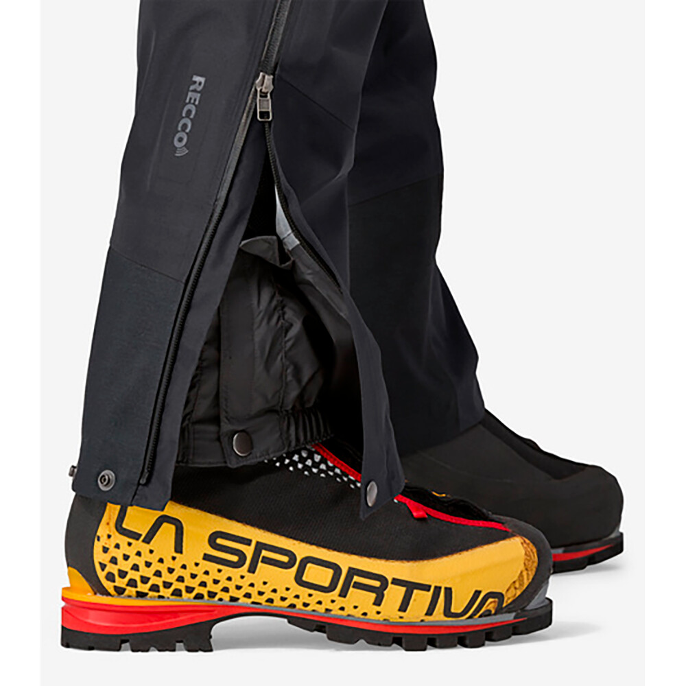 Pantalonii sunt realizați dintr-o membrană Gore-Tex în trei straturi, impermeabilă, dar respirabilă. Materialul durabil superior este fabricat din poliester reciclat. Tăietura cu genunchii preformați și o croială cu burduf oferă libertate de mișcare. Fermoarele laterale pe toată lungimea permit îmbrăcarea ușoară și reglarea temperaturii. Un localizator de avalanșă Recco® este încorporat în picior.