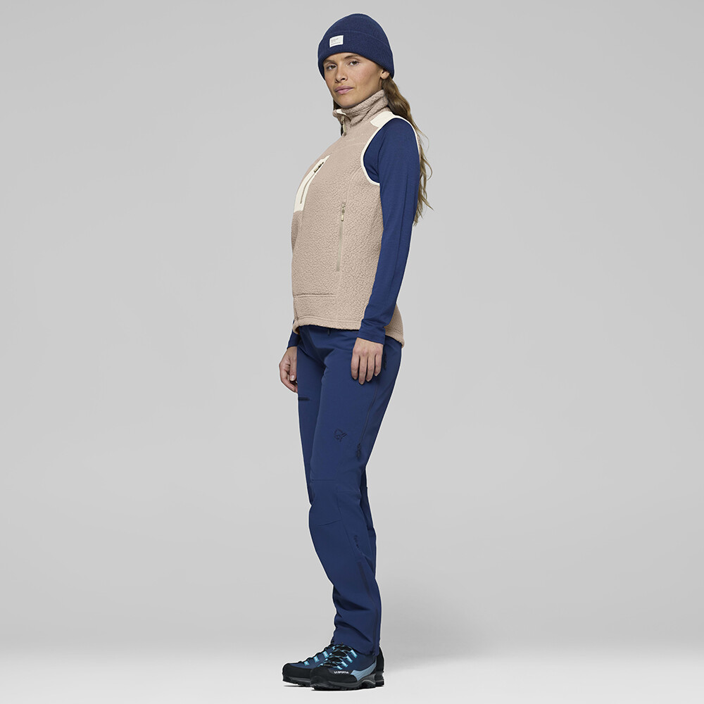 Trollveggen warm3 Vest Women de la Norrona utilizează o țesătură avansată Pile fleece knit care nu este doar ușoară, ci, mai important, foarte izolantă și durabilă. Chiar și după o utilizare intensă prelungită, vesta își păstrează aspectul original și flexibilitatea, ceea ce o face un partener de încredere pentru multe sezoane. Este excelentă ca strat izolator sub o jachetă hardshell, dar datorită rezistenței sale la vânt poate servi și ca strat exterior în timpul mișcării active în condiții mai blânde. Caracteristicile practice precum două buzunare pentru încălzirea mâinii, un buzunar pe piept și un guler înalt de protecție sporesc confortul în condiții de frig, în timp ce croiala regulată permite stratificarea ușoară. Purtați un tricou merinos sub această vestă fleece. Aceasta își va găsi întrebuințarea mai ales în timpul activităților precum trekking și drumeții, alpinism sau schi alpinism și schi.
