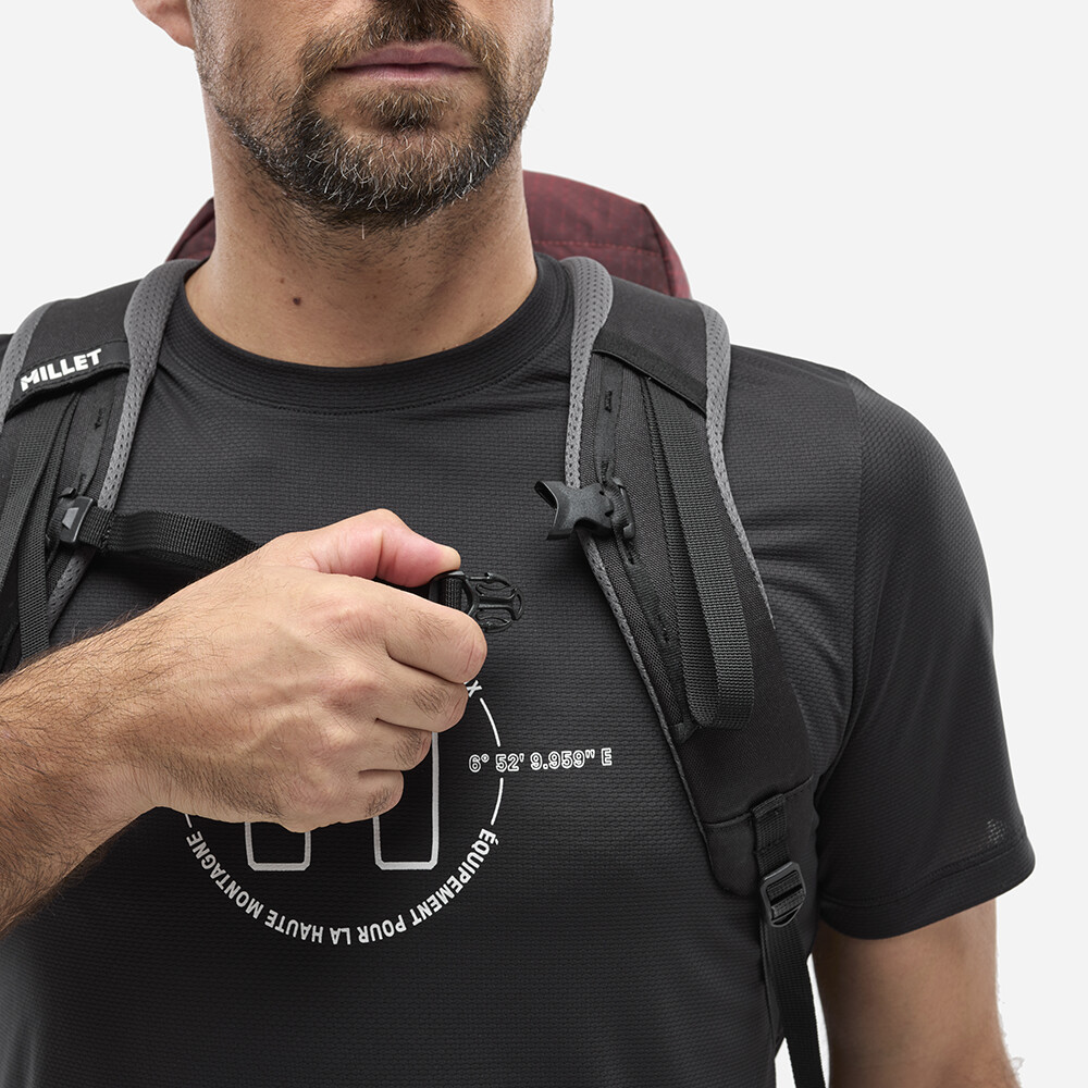 Rucsac de alpinism cu închidere superioară roll-top și intrare laterală cu fermoar. Poate transporta frânghie, pioleți, bețe și bucle pentru suport pentru cască. Dispune de un spate din spumă conturată, curea reglabilă pentru piept și talie.