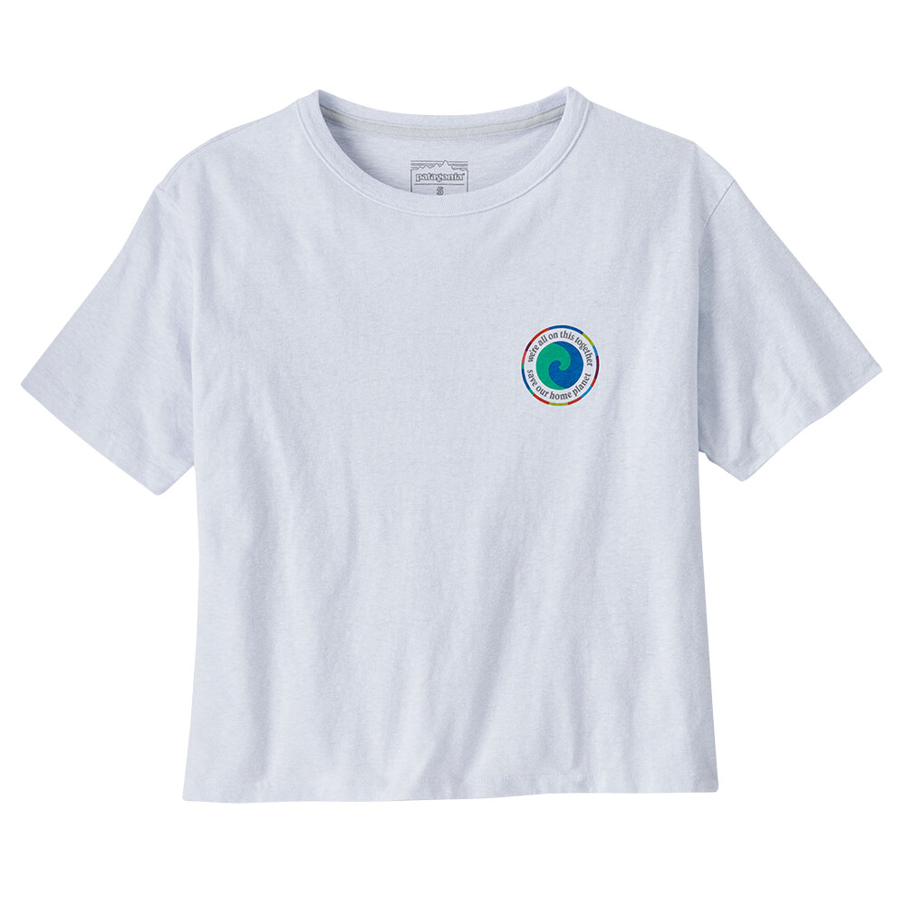 Tricoul Patagonia Women's Unity Fitz Easy Cut Responsibili-Tee este fabricat din țesătură reciclată care reduce dependența de materiile prime virgine, așa cum reiese din imaginea de pe declarația de intenție a tricoului de a "salva planeta noastră de origine." Tricoul este fabricat într-o fabrică Fair Trade Certified™.