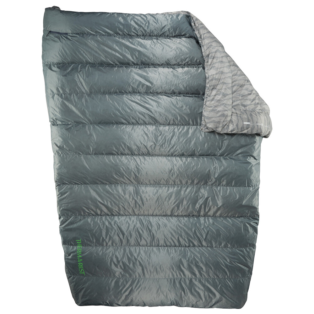 Pătura Quilt de la Therm A Rest este un sac de dormit fără fermoar, glugă și fără izolație inferioară. Versiunea Double este dimensionată pentru dormit confortabil pentru două persoane. Economisiți greutate în comparație cu sacii de dormit tradiționali și, de asemenea, spațiu în rucsac. Astfel, Quilt este perfect potrivit pentru a dormi într-un cort în timpul drumețiilor de mai multe zile, dar îl puteți folosi și la cabanele de munte. Datorită umpluturii de pene hidrofobe, nu trebuie să vă faceți griji cu privire la umiditate, impregnarea Nikwax® protejează penele de roua de dimineață și de ploaia ușoară. Partea de jos a cuverturii este un footmuff, pe care îl puteți trage peste caravană sau vă puteți menține picioarele confortabil de calde.