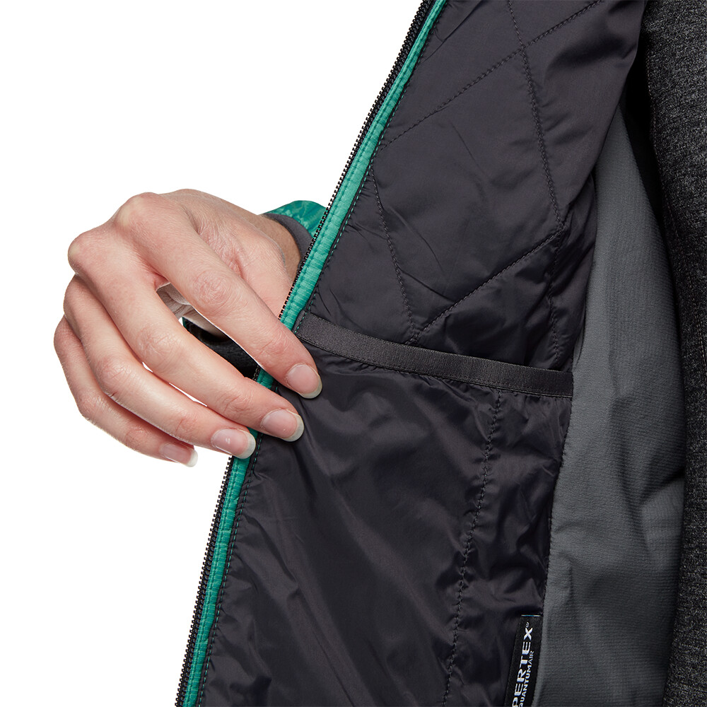 Jacheta izolată din puf de gâscă pentru femei încălzește perfect. Materialul exterior reciclat, cu tratament hidrofug DWR (fără PFC), protejează de umiditate. Buzunarul stâng cu fermoar este folosit pentru împachetarea jachetei.