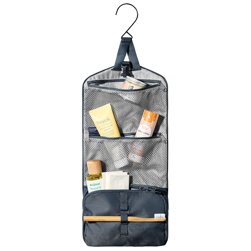 Geanta de spălat deuter I are un cârlig detașabil, astfel încât să puteți agăța geanta în baie sau în diverse locuri (de exemplu pe o creangă) în timpul călătoriilor. Un compartiment mare cu fermoar și două buzunare din plasă cu fermoar permit o organizare clară. O închidere cu cataramă asigură depozitarea sigură a conținutului, în timp ce buclele elastice pot fi utilizate pentru periuța de dinți și articolele de toaletă mai mici.