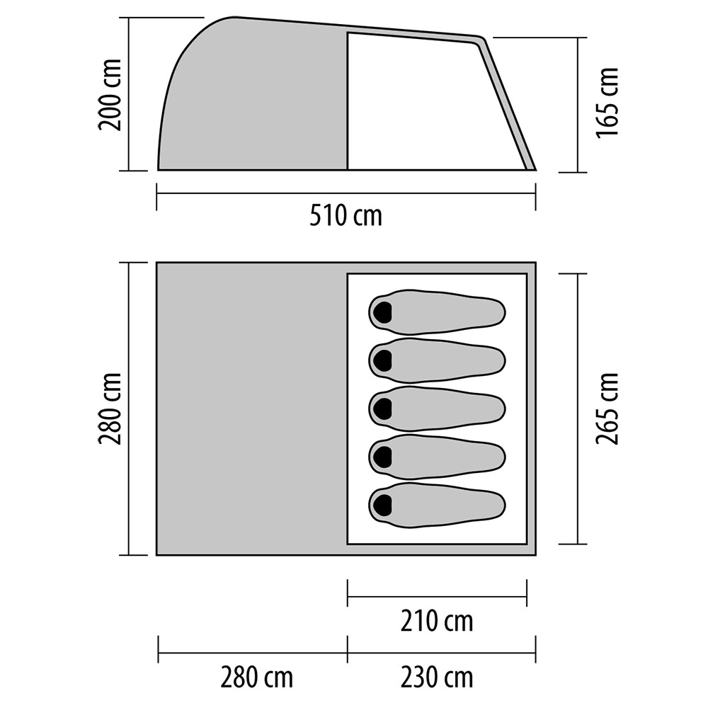 Cort mare pentru până la șase persoane. Are două dormitoare separate și două intrări în partea centrală. Acestea pot fi deschise ca o copertină. În interior veți găsi buzunare pentru lucruri mici și găuri pentru tragerea cablurilor electrice în afara intrării.