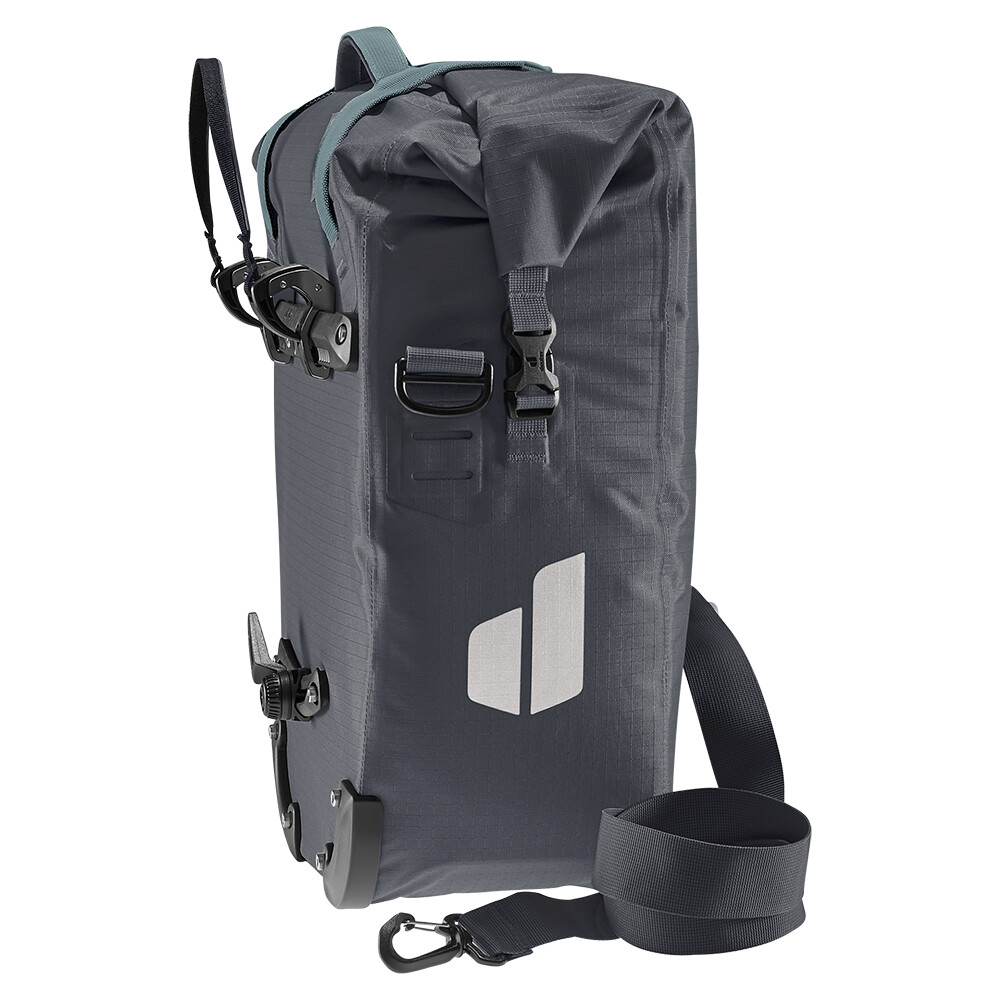 Sistemul nou dezvoltat BagFix cu eliberare rapidă de la deuter vă permite să pedalați în liniște, bicicleta suportând cea mai mare parte a încărcăturii - și nimic pe spate. Doar o tragere rapidă pe mânerul de eliberare și geanta este desprinsă și gata de utilizare ca geantă de umăr. Datorită închiderii roll-top cu fermoar bidirecțional, puteți extinde capacitatea cu încă 10 litri.